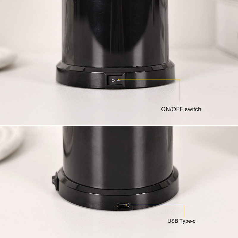 Lucerna nitido exteriore nigro ficta, minimalist et eleganti specie gloriatur, eamque specimen pro cubiculis, vivis cubiculis, officiis, vel etiam singulari dono iactat. Nitidum basi et operculo nigro non solum insignem discrepantiam praestant colorum venustiorum sed etiam firmitatem intus praestantem