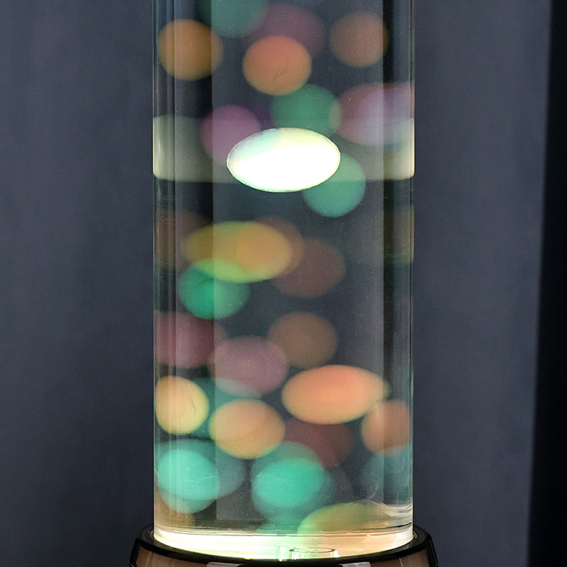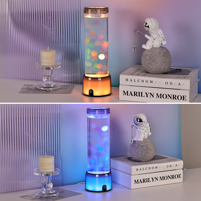 Lucerna alta, cylindrica elegans figuram dat ei moderni, minimalists aspectus complementorum varios stylorum interiorum. Eius corpus diaphanum plenam visibilitatem elementorum internorum permittit, inter quas fluitantia gelata et corusci luminis reflexiones. Liquor intus peculiariter elaboratur ad fluxum aquae simulandi, augens realismum motus fluitantis. Sicut LEDs transferunt colores, jellyfish apparent pulsum cum vita, profunditatem et motum addendo ad scenam.