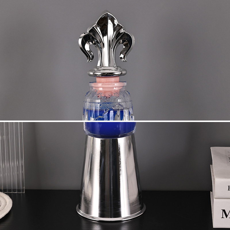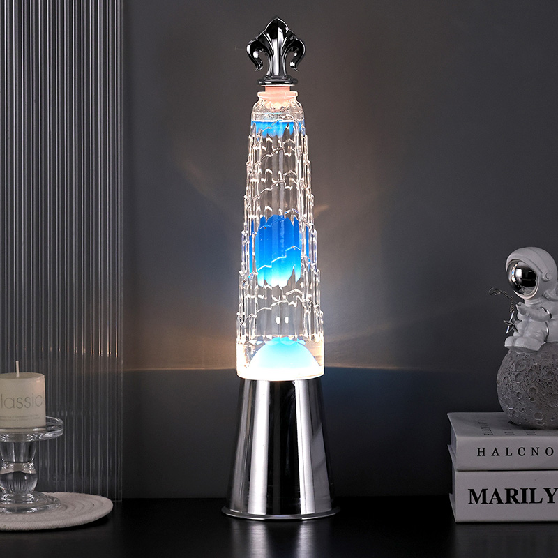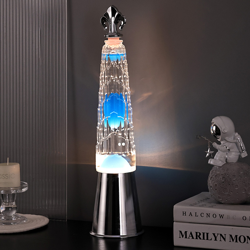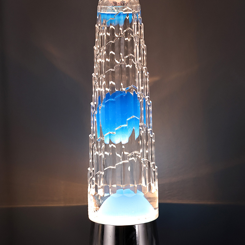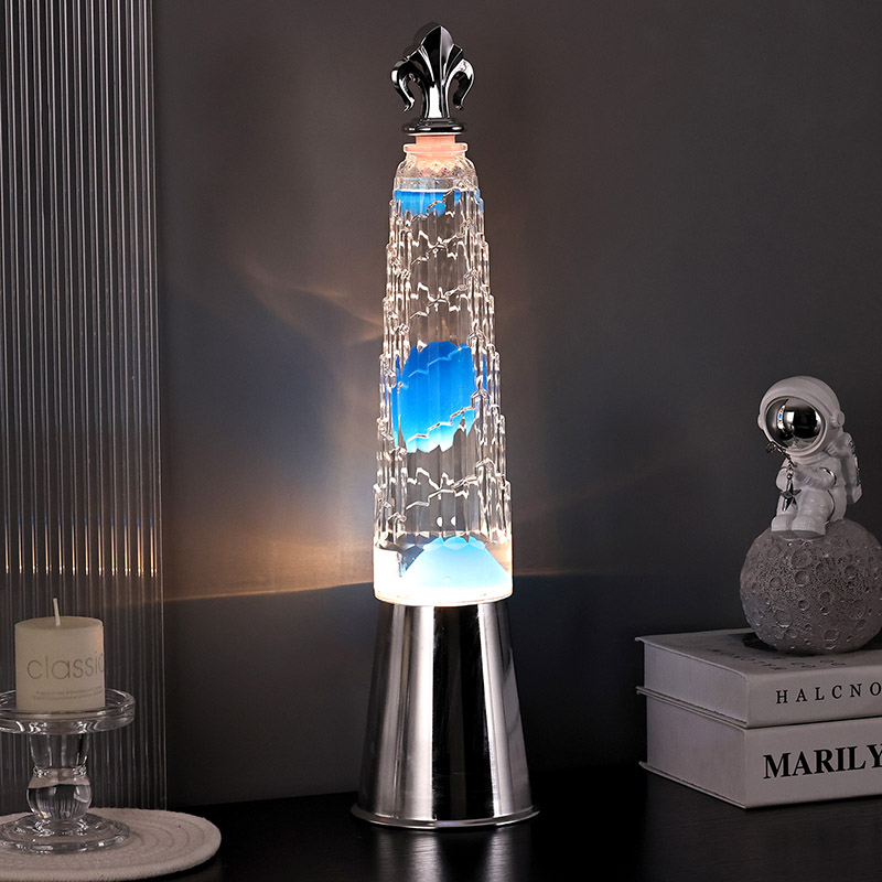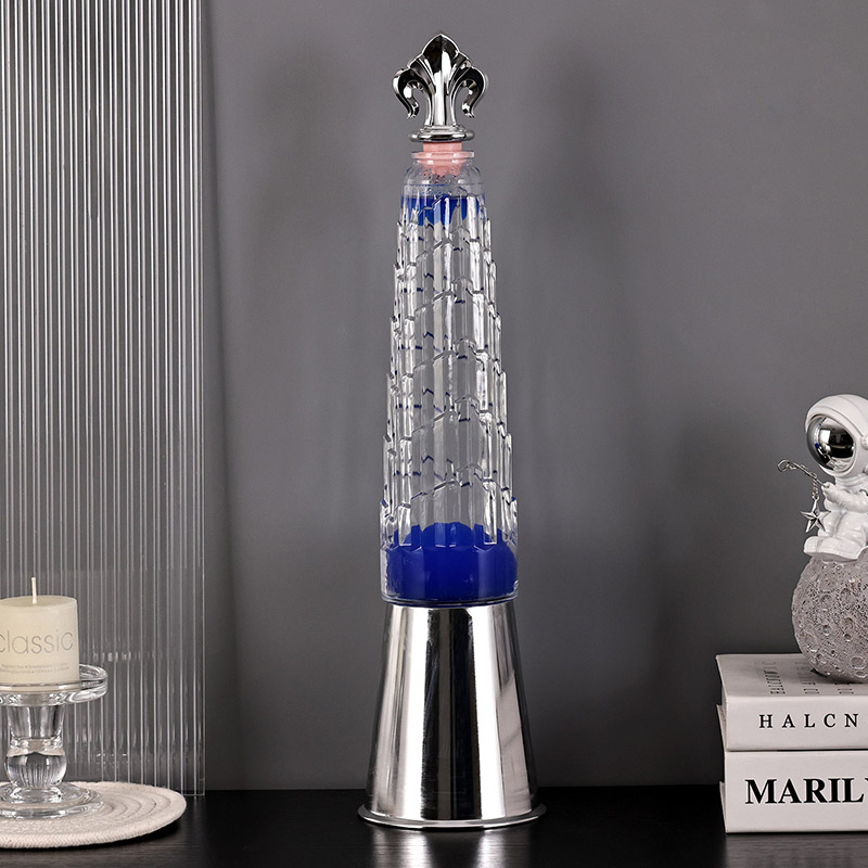 Turris umbraculum lavae lucernae in mensa lampadis notat a classic turri formata design, cum exquisitis ornamentis metallicis in summo fixa est, simplex et nobilis. In utre pellucido vitreo, cera caerulea adest